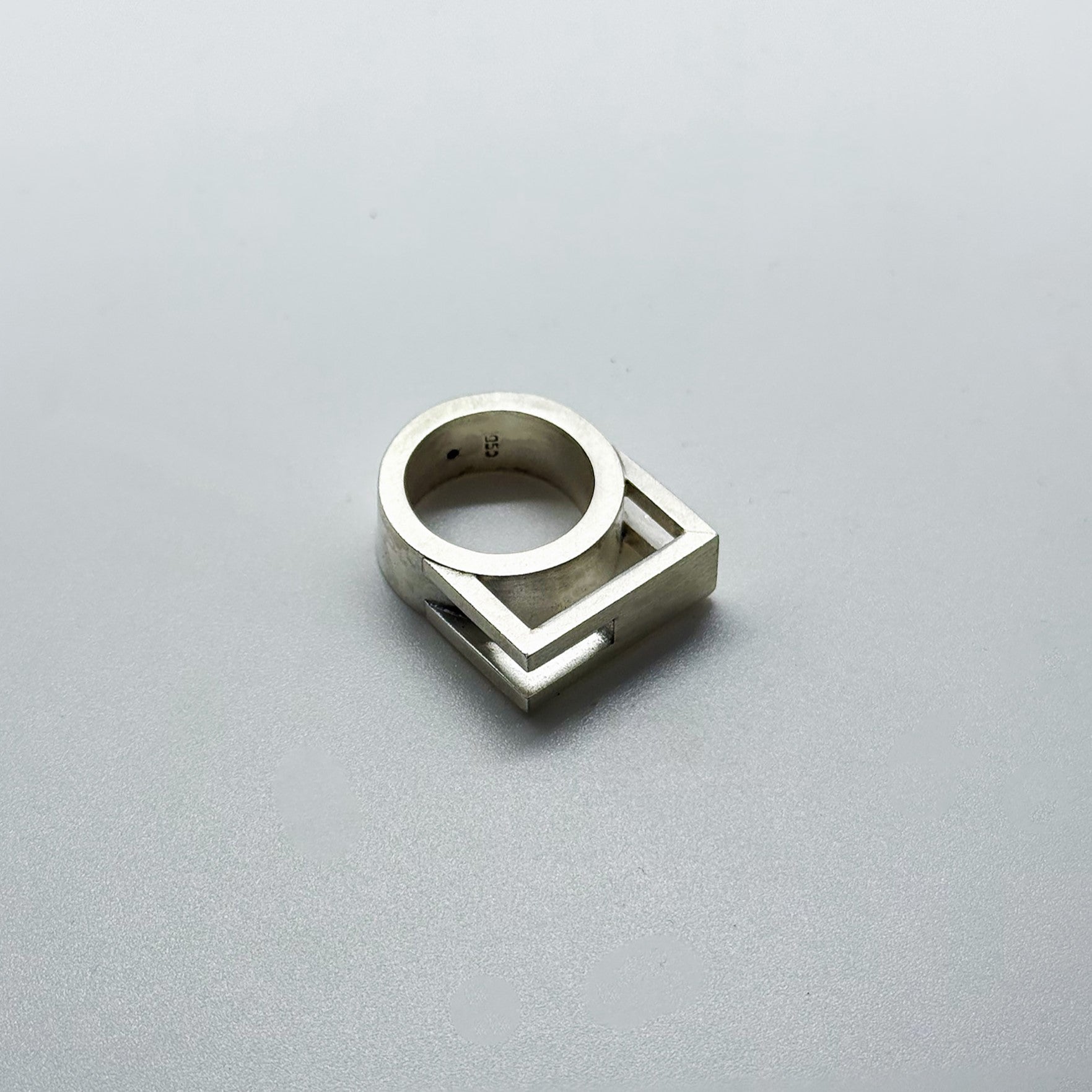 A unique geometric statement ring crafted from sterling silver.